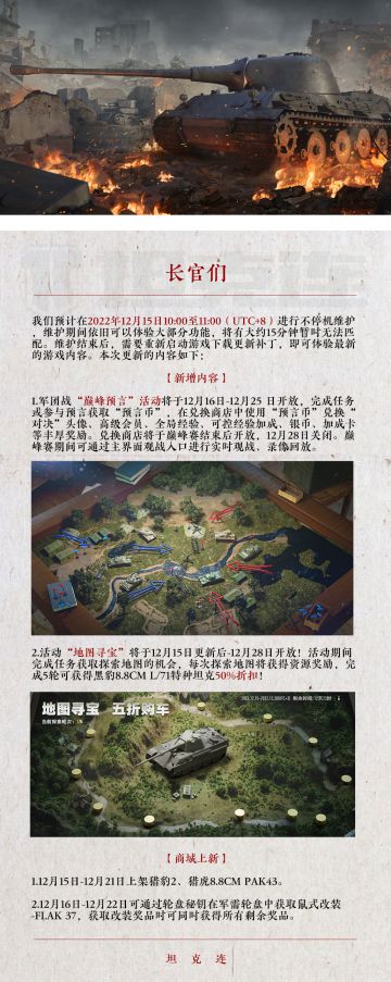 { "text": "#坦克连# 双旦盛典即将开启!全新特种坦克、兑换商店等丰富活动不要错过!", "raw_text": "" }