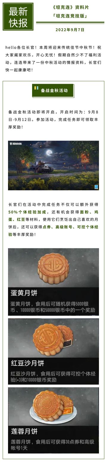 { "text": "#坦克连# “备战金秋”活动来啦!烹饪月饼,得点券、高账等丰厚奖励!", "raw_text": "" }