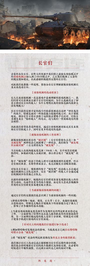 { "text": "#坦克连#“辛苦长官们查收!本次体验模式中的侦察机制2.0以及未来改动方向的解答说明来啦!", "raw_text": "" }