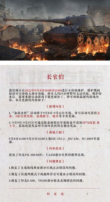 { "text": "#坦克连# “备战金秋”活动即将开启!军需轮盘更新、坦克模型优化及问题修复详情来啦!", "raw_text": "" }