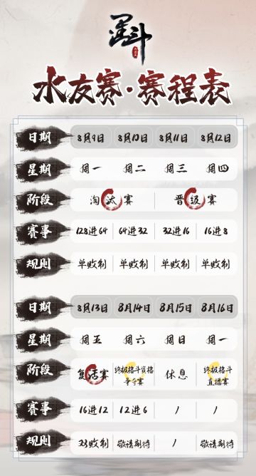 "text": "【《墨斗》官方第一届水友赛报名】\n\n报名时间:8月7日中午12:00正式开启报名提交,8月8日晚上22:00关闭!\n\n届时大家可点击下方报名表链接填写游戏昵称并上传战力截图报名\n\n※注意:比赛禁止出现恶意名称和恶意签名\n\n提交报名后会自动跳转到比赛群二维码,扫码加群即可报名本次比赛。\n\n报名表链接:https://docs.qq.com/form/page/DWEtMRHpaTFNSUEdS\n\n最后入选参赛资格将根据报名表中的战力由高到低进行排序,前128名获得参赛资格。\n\n比赛详情:https://www.taptap.com/topic/18936350",