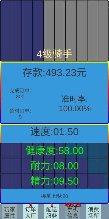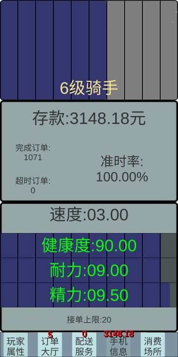 { "text": "发一个自己总结的攻略\n第一眼看到这个游戏,就立刻下载体验了,怀念以前的跑单生活\n\n新手入门攻略,进入游戏入职,选项没有啥影响的数值,凭喜好,然后开工\n\n玩家属性:骑手各方面基本数值\n\n耐力:1级骑手送3单消耗1点耐力,每提升1级加3单\n\n精力:接单送单所消耗的精力,每小时消耗0.5\n\n健康度:健康度附加饱食度数值在一起,只能看到健康度数值,饱食度在消费场所-健康商品-购买是回提示饱食度当前值\n\n精力,耐力,健康度,饱食度,数值归零都会影响跑单限制不能接单,注意补充\n\n订单大厅:订单的基本信息,取餐跟送餐的距离都是距离你当前定位的位置,绿点骑手当前位置,红点取餐位置,黄点送达位置,大厅订单10秒刷新一次\n\n配送服务:抢到的订单会发送到配送服务里,玩家只需要点击取餐,骑手会自动移动到取餐点,然后配送完成后会获得配送费\n\n超时跟取消订单都是扣除手机的存款,超时扣10块,取消订单扣10块,可在消费场所里订单商品看广告获取广告点购买加时卡跟超时卡来预防过失扣款\n\n手机信息:当前收入存款的数值\n\n消费场所:速度商品-提升骑手的送餐速度\n健康商品-补充健康度跟饱食度\n医疗商品-补充耐力跟精力值\n订单商品-加时卡-超时卡-无息备用金-备用金是暂时给你的无利息的周转资金,在收工下线后退出游戏时从手机信息的存款扣除500,借的钱终归要还的\n\n最后说下新人入门的攻略,体验游戏一周了,tap游戏时长14.9小时,游戏开始只有10块的存款,怕超时的骑手接一单,取了餐配送的路上可以去大厅抢一个在送达点附近的配送单,这样既节省了配送等待的时间也增加了效率,熟悉了能力强一点的玩家一次可以抢多个订单一同配送,比如取餐顺送餐的顺路单,取送方向大致的多家订单,可以大大提升赚钱的效率,万事开头难,有人抱怨一个小时送3-4单,赚了15-20块左右,存款都用来补充精力耐力不赚钱,别气馁50单量升级单2级骑手,100单升级3级骑手,要想办法在最短的时间里配送最多的订单,当然也需要3分的运气,跑的单多了骑手等级每提升一点耐力可送更多的订单,只要坚持熬过100单到达3级骑手,跑的赚钱的速度远远大于消耗补充的开销了,外卖人,加油!最后附上一个我的信息,做自己的跑单王", "raw_text": "" }