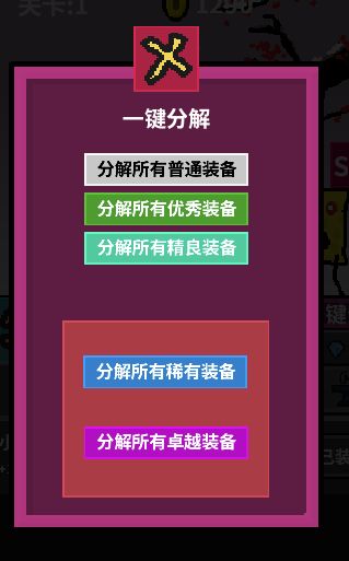 "text": "2020年11月27日\n1.5.20(27)\n新增 装备锁 一键分解的福音\n藏品饭卡修改 150级-4怪\n背包上限增加到120\n调整前10次转生关卡为60\n11次以后转生关卡为100\n修正打开一键分解窗口 单独分解装备窗口不关闭问题\n以及其他一些没必要说的bug修复",