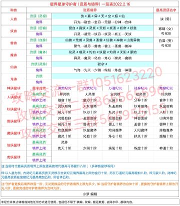 星界守护者(资质、境界)一览表2022.2.16