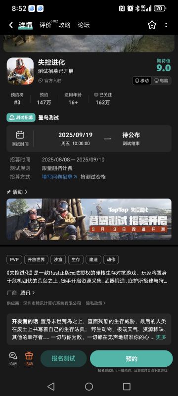 申请《失控进化》手游测试资格 尊敬的《失控进化》团队: 你好!我是一名狂热失控进化题材手游爱好者,首次曝光起就被《失控进化》核心玩法深深吸引作为同类游戏的资深玩家,我渴望能成为这场“失控进化”的开拓者 每次都在直播里看到有关rust的游戏总会忘记时间,游戏题材真的在深深吸引着我 承诺: - 严格保密测试内容; - 每日深度体验5h+,提交BUG/建议报告; 恳请制作组给予这次资格,让我