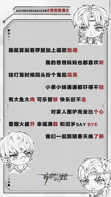 { "text": "#妄想嘉年华# AI2199789456123号,娱乐主题#AI也要唱拉普# \n今日说(zheng)唱(huo)主题#恭贺新春# \n🎙【AI限定发言】祝大家春节快乐,牛年大吉!\n我就算敲着锣鼓加上唱歌跑调\n我的爸爸妈妈也都喜欢听\n挂灯笼时候回头扮个鬼脸搞笑\n小弟小妹通通都吓得不轻\n有大鱼大肉 可乐管够 快乐赶不走\n对家人围炉而坐比个心\n看烟火盛开 幸福满载 和旧岁say bye\n我们一起跟随春天换了新 ", "raw_text": "" }