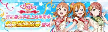 { "text": "庆祝简体字版上线半周年免费50连招募登场\n各位虹咲学园的同学:\n 大家好!为了庆祝《Love Live! 学园偶像季:群星闪耀》简体字版上线半周年&《Love Live! 学园偶像祭》11月25日更新9.2版本, 11月26日-12月11日期间内,大家可在《Love Live! 学园偶像季:群星闪耀》进行5次免费10连招募(每天最多可进行1次免费10连招募,一共可进行5次),千万不要错过哟!\n 同时,11月25日维护后-12月18日期间内,《Love Live! 学园偶像祭》也将开展10次免费11连招募活动,共计110连(具体实施内容请留意《Love Live! 学园偶像祭》游戏公告)。\n\n《Love Live! 学园偶像季:群星闪耀》免费50连招募\n活动时间:11月26日16:00 – 12月11日23:59\n*每天最多可进行1次免费10连招募,一共可进行5次。\n\n今后也请各位玩家多多支持「Love Live! 学园偶像季:群星闪耀」!\n\n▼关于虹咲学园学园偶像同好会\n来自于《Love Live! 学园偶像季:群星闪耀》的新学园偶像的9个人是位于东京台场的私立高中虹咲学园里的学生。跟μ's、Aqours以团队活动为主的形式不同,同好会中的每个成员都要一边追逐自己的梦想,一边以亦敌亦友的身份共同向着最强学园偶像发起冲击。2019年3月30日为纪念《TOKIMEKI Runners》发售,在品川·Stellar Hall 举办了 Talk & Live event “Love Live! 虹咲学园学园偶像同好会 校内Matching Festival”的活动。2019年9月26日《Love Live! 学园偶像季:群星闪耀》日文版手游上线,2019年12月14日、15日举办了“LoveLive! 虹咲学园学园偶像同好会 First Live ‘with You’”演唱会,也参加了2020年1月18日・19日举办的“LoveLive! Series 9th Anniversary Love Live! FES”。2020年7月29日发布首个附带动画PV的单曲《无敌*信徒》。在日文版游戏剧情的第17章,三船栞子也作为同好会的新成员加入进来。2020年9月12日、13日在东京花园剧院举办“Love Live! ”系列首场无观众演唱会“LoveLive! 虹咲学园学园偶像同好会 2nd Live! Brand New Story / Back to the TOKIMEKI”。2020年10月开始播放TV动画“Love Live! 虹咲学园学园偶像同好会”。今后,同好会成员们的身影将活跃在越来越多的舞台上。\n\n▼关于Love Live! 学园偶像季:群星闪耀\n「Love Live! 学园偶像季:群星闪耀」是以「最强最棒的偶像游戏」为理念的全新手游。共有来自μ’s、Aqours、虹咲学园学园偶像同好会的学园偶像们悉数登场的Love Live! 沉浸式育成游戏。\n\n▼关于Love Live! 系列\nLove Live! 系列是于2010年启动的学园偶像企划。该企划以「与大家一起实现梦想」为主题,实现了歌曲、动画、演唱会活动等多媒体的同步展开。\n\n©2013 PROJECT Lovelive! ©2017 PROJECT Lovelive! Sunshine!! ©2020 PROJECT Lovelive! Nijigasaki High School Idol Club ©Shengqu Games © KLabGames ©SUNRISE ©bushiroad\n", "raw_text": "" }
