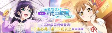 { "text": "若能与你在雨中歌唱招募登场(前篇)!\n【举办时间】2021年12月6日 16:00~ 2021年12月13日 16:00\n欢迎来到「Love Live! 学园偶像季:群星闪耀」。\n\n「若能与你在雨中歌唱招募登场【前篇】」来啦!\n本次招募活动分为前篇与后篇,且登场的新UR学园偶像各不相同。\n后篇登场的招募内容请于日后发布的「若能与你在雨中歌唱招募【后篇】」相关公告中确认。\n\n在前篇招募中全新登场与精选的学园偶像如下!\n【UR】[就是这样!]东条希\n【SR】[要用到特殊工具的说]国木田花丸\n\n※【UR】[就是这样!]东条希 将不会在后篇招募中登场。\n※前篇中登场的 【SR】[要用到特殊工具的说]国木田花丸 也会在后篇招募中登场。\n\n使用编入了本次全新追加的学园偶像的队伍完成演唱会时,可获得的剧情活动「若能与你在雨中歌唱」活动点数将会增加♪\n※详情请参考『剧情活动「若能与你在雨中歌唱」登场!』的公告。\n\n特训还可解锁专属服装。\n\n此外,在「10次招募」中,必定会出现1位SR或以上的学园偶像!\n每天还有1次以爱星(付费)×10进行招募的机会喔!\n进行招募后,还可额外获得赠品「闪耀水晶」\n\n本次的新学园偶像将从登场的招募开始时,新增到道具交换所的闪耀水晶分页中。\n新增在闪耀水晶分页中的学园偶像,即使登场的该招募已结束,直到闪耀水晶的交换期限结束为止,都可以在道具交换所中进行交换。\n\n※可获得的闪耀水晶的颜色将会依招募而异。\n※前篇与后篇招募中可获得的闪耀水晶颜色相同。\n※每天限定进行1次的爱星(付费)招募无法获得闪耀水晶。\n\n注意事项\n・招募可能会获得相同的学园偶像。\n・每天限定进行1次的爱星(付费)招募,将于每天的0:00重置。\n・精选学园偶像的出现概率高于相同稀有度的其他学园偶像。\n・普通的1次招募与每天限定进行1次的爱星(付费)招募中的学园偶像出现概率相同。\n・闪耀水晶可用来在道具交换所交换各式各样的道具。请注意,在交换时间结束后,闪耀水晶将自动变为「闪耀碎片」。\n・新登场的学园偶像为先行开放的成员,有可能于今后预定举办的活动或招募中再次登场。\n・已公告的内容也可能有临时变更。\n\n今后也请各位玩家多多支持「Love Live! 学园偶像季:群星闪耀」!", "raw_text": "" }