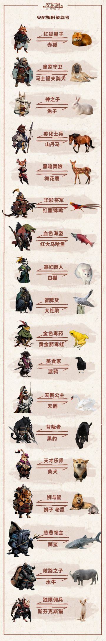 【有奖活动】动物拟人形象征集! 《安尼姆的无尽旅途》中每一位角色的原型参考都是一种现实动物,现征集大家针对角色的原型做自己的拟人理解 (˵¯͒〰¯͒˵)绘画形式不限。 参与方式: 微博:发布图片,@安尼姆的无尽旅途 官方微博 TapTap:社区内发布图片,选择#角色想法#子版块 投稿时间:2023年7月14日-2023年8月8日 评选时间:2023年8月9日-2023年8月18日 获奖公示:202
