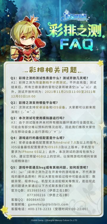 "text": "【彩排之测】预下载开启!\n\n叮咚!您的【彩排之测】邀请函已送达♪\n一起参与月亮演出团的彩排,了解更多幕后花絮吧!\n\n■预下载时间:11月24日\n■测试时间:11月25日11:00-12月3日18:00\n\n为避免网络拥挤、下载速度较慢等情况,您可前往页面预先下载游戏(◕ᴗ◕✿) \n如有未能安装等情况发生,请联系客服姬(客服QQ号:800864530)协助处理!\n贝尔德大陆静候您的到来!\n\n《宝石研物语:伊恩之石》运营团队",