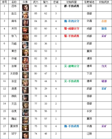 所有武力达到50的武将排行榜