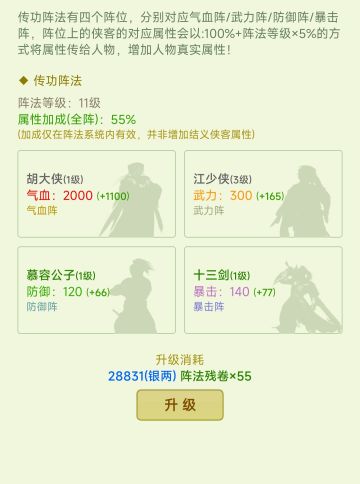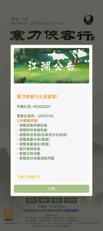 { "text": "【更新礼包码:UP221115】\n1.29更新内容\n- 调整侠客突破机制\n- 调整同伴突破机制\n- 调整阵法系统(去除百分比加成)\n- 调整装备升级(增强)\n- 调整装备强化(增强)\n- 提升离线收益\n- 修复已知问题", "raw_text": "" }