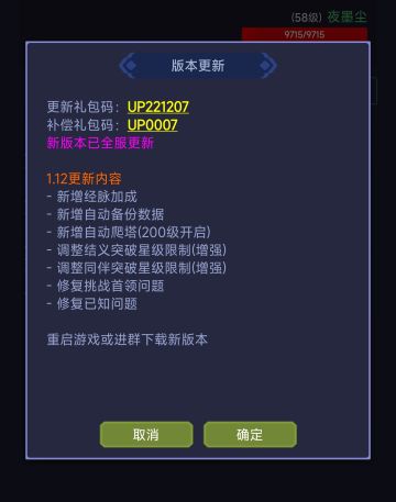 { "text": "更新礼包码:UP221207\n本次更新为强制更新,需要Tap完成更新后方可进入游戏,感谢支持!\n\n1.12更新内容\n- 新增经脉加成\n- 新增自动备份数据\n- 新增自动爬塔(200级开启)\n- 调整结义突破星级限制(增强)\n- 调整同伴突破星级限制(增强)\n- 修复挑战首领问题\n- 修复已知问题", "raw_text": "" }