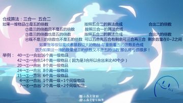 { "text": "整理了一下合成算法做了一张图发个攻略哈哈哈 背景图是用的官方的壁纸\n下面是文字版本:\n\n合成算法:三合一 五合二\n如果一堆物品\n①是五的倍数 按照五合二的算法合成 合出二的倍数\n②是三的倍数且不是五的倍数 按照三合一的算法合成\n③是三的倍数也是五的倍数 按照五合二的算法合成 合出六的倍数\n④既不是三的倍数也不是五的倍数 可以五合先五合有剩余可三合再三合 剩余数量在0~2之间\n如果是等级较高或者基数较大的物品 尽量数着五的倍数去合成\n因为如果这一堆的数量是三的倍数又不是五的倍数 那么将亏损很多!\n举例: 40→①→合出16个高一级物品 \n 42→②→合出14个高一级物品(因为是3合所以合出来比40个少)\n 20→①→合出 8个高一级物品\n 24→②→合出 8个高一级物品\n 15→③→合出 6个高一级物品\n 4→④→合出 1个高一级+1个同级物品 \n 7→④→合出 2个高一级+2个同级物品\n \n", "raw_text": "" }