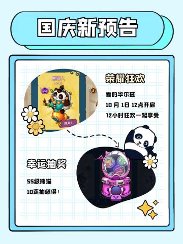 { "text": "亲爱的探险者们,\n\n本周五(10月1日)惊喜活动已安排!\n国庆当天还有福利上线,\n敬请期待吧~\n\n", "raw_text": "" }