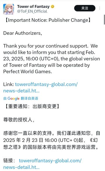 《幻塔》国际服由完美世界接手
