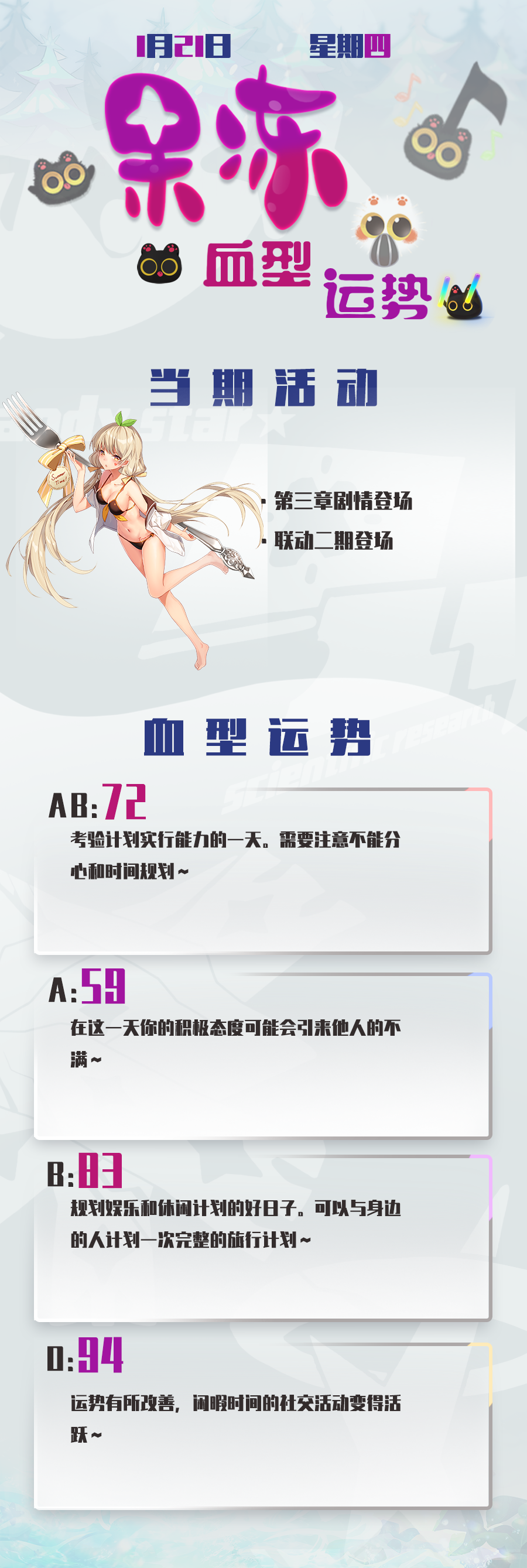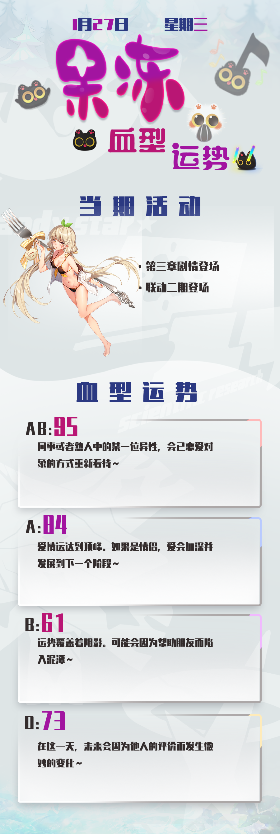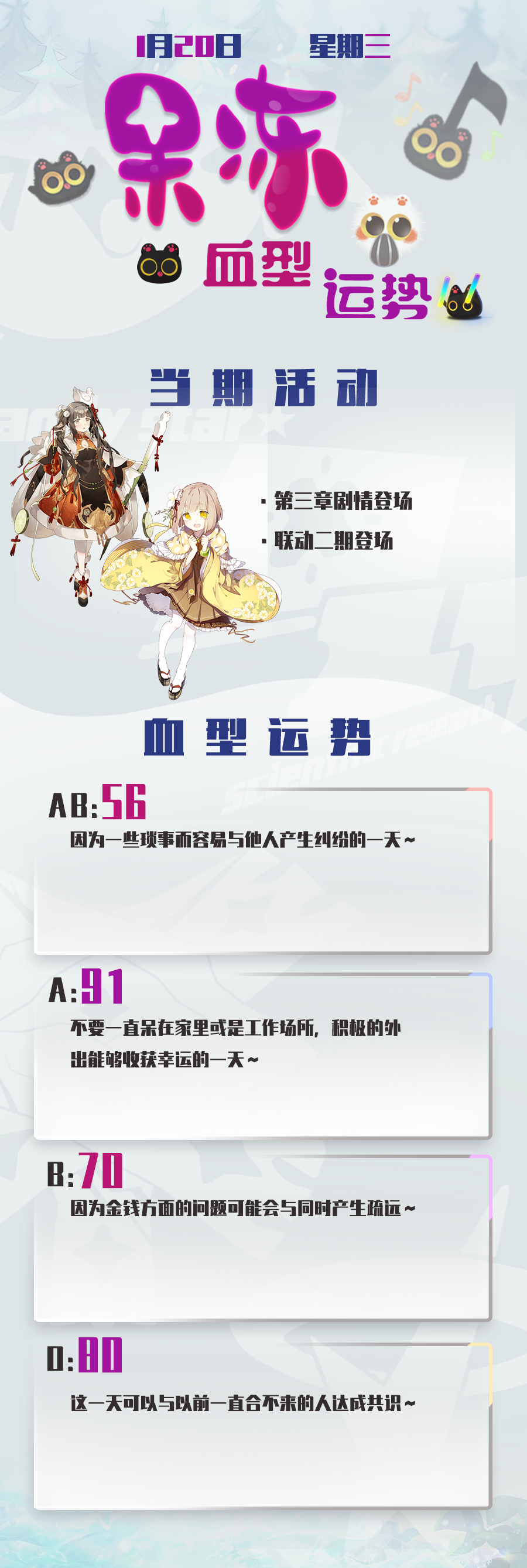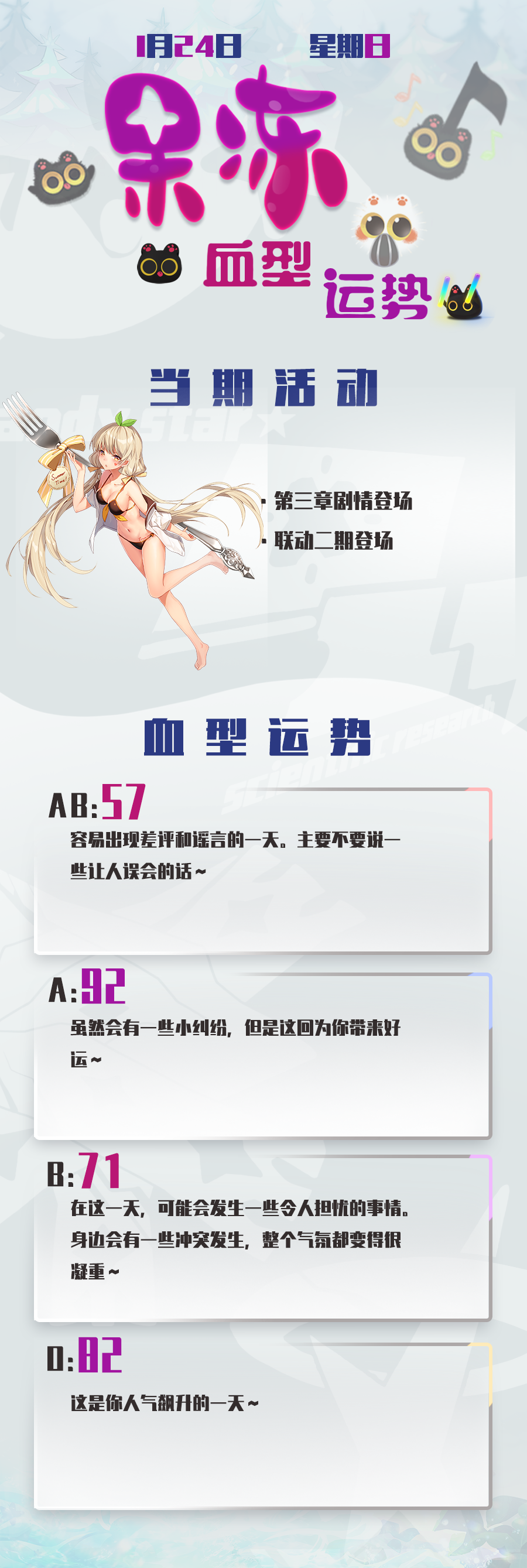 { "text": "今日份果冻血型运势奉上~\n希望小果冻们在联动二期里得到想要的东西~\n昨天都过了腊八,马上要过年了,所以之后就是努力做新年版本了,尽请期待哦~", "raw_text": "" }