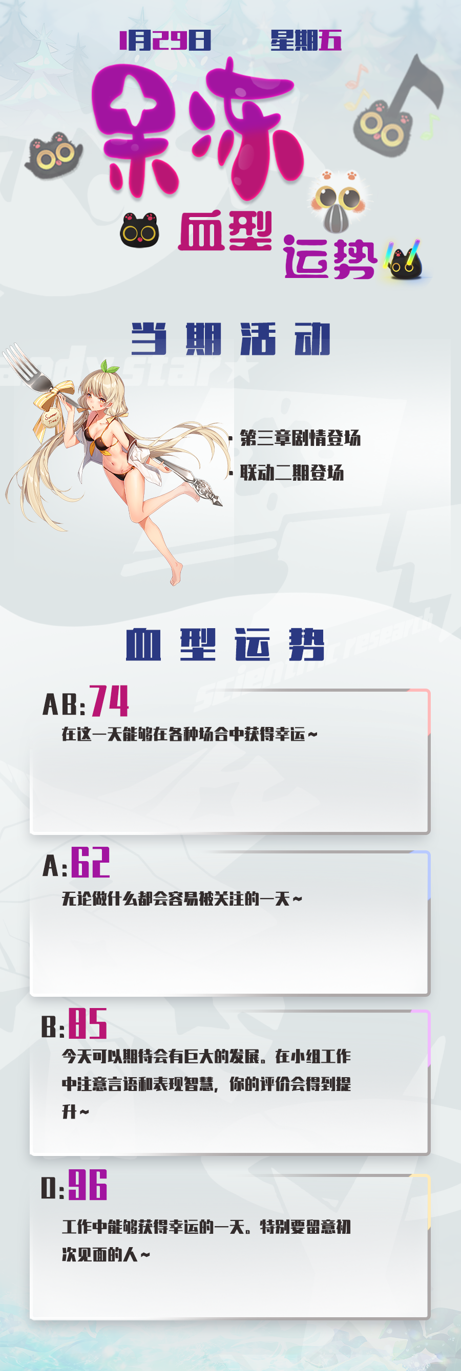 { "text": "今日份果冻血型运势奉上~\n离春节版本越来越近了,正在努力进行最后的开发测试工作\n今天会放出新人物的人设图的\n是和新的和bong的联动人物,大家可以猜猜会是谁呢\n", "raw_text": "" }