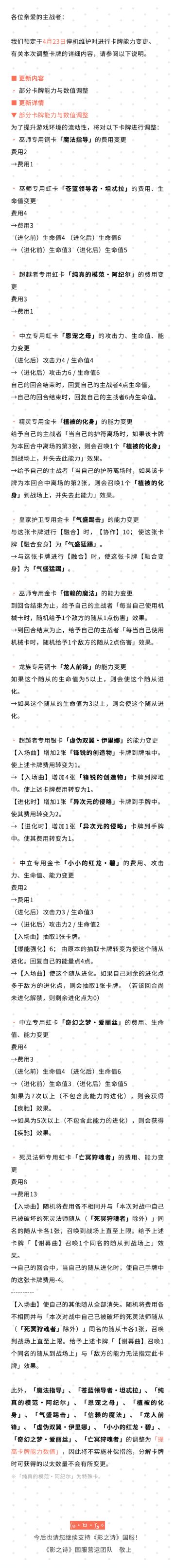 《影之诗》4月23日服务器维护时卡牌能力变更调整公告#影之诗