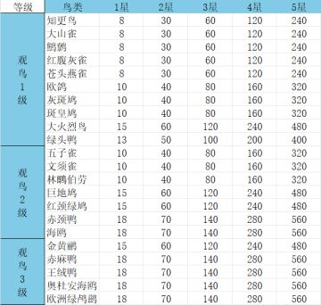 观鸟1-10级价格简单一览