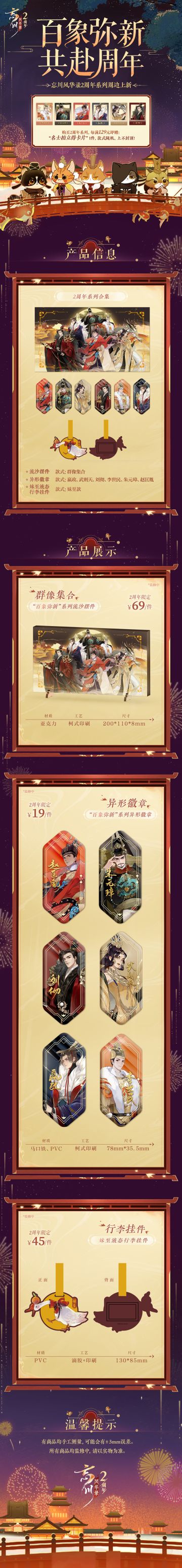 【#忘川风华录二周年# 丨百象弥新·共赴周年】 使君大人好呀,二周年系列新品周边携手官方福利终于同各位见面了! 【周年限定·新品来袭】任意2件可享受88折优惠 ①“百象弥新”系列流沙摆件:亚克力材质,内含流沙,千秋帝王群像登场; ②“百象弥新”系列异形徽章:六位名士悉数登场,统领各代盛世; ③ 妹至液态行李挂件:信任与萌态集于一身的鹅鹅鹅妹至来袭~ 【新品限时优惠】活动时间:3月19日-3月26日