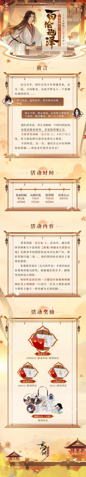 【「定江东·上」孙策篇·参与照影征集赢万元现金】 孙郎武略周郎智,奇姿联壁耀江东。波澜壮阔的时代画卷即将展开,这一次,两位少年将以何种装扮在忘川相遇?由各位使君来决定! 全新秉笔鸿篇「定江东·上」孙策篇将于4月27日上线,烟焰横江,定分天下,江东故梦待使君再绘! 通过活动第四章困难关卡获得的【孙策/周瑜永久照影自选】兑换券中的照影将由本次照影征集比赛产出,照影奖励只能二选一,商店将同时上架两款照影