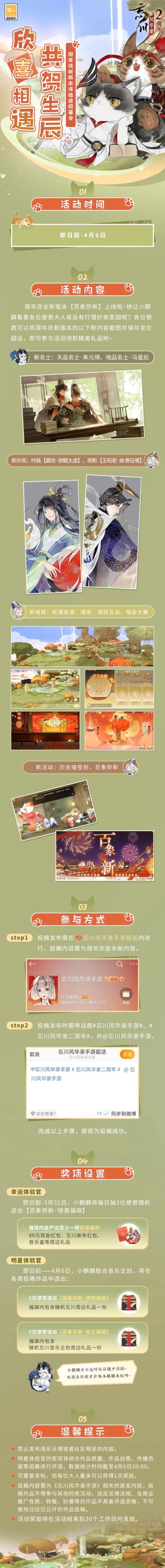 【#忘川风华录二周年# 丨祝福征集活动】 阳春三月万物新,忘川将迎来热闹的生日宴!名士们为了准备宴会可是加足了马力,小麒麟也没有偷懒哦,悄悄用相机记录下了这一场景~ 使君你看,朱元璋撑脸的镜头像不像在“比耶”?小麒麟赶忙举起爪子来了一张合影,各位使君也快来一起“比耶”吧! 活动时间:2023年3月7日-3月21日 活动内容: 录制《忘川风华录手游》二周年祝福视频,投稿视频标题需含有【忘川风华录二周
