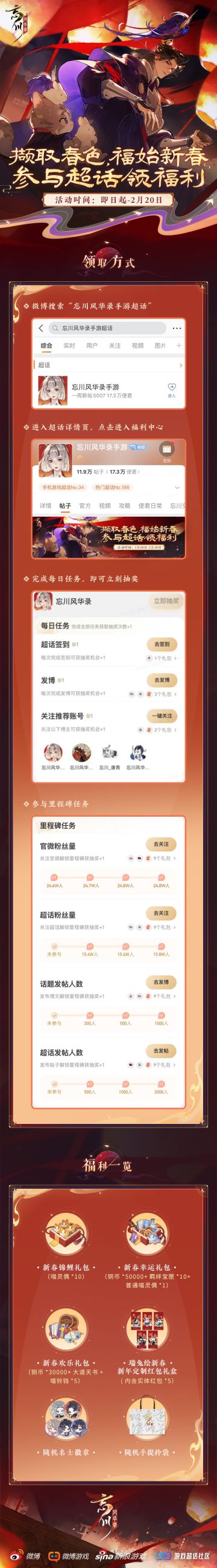 撷取春色,福始新春,小麒麟携超话福利给使君送祝福啦!1月20日——2月20日,微博超话活动【福利中心】限时开放! 在超话详情页点击进入【福利中心】,完成每日任务的使君大人即可获得抽奖机会,赢取游戏礼包及周边好礼!参与里程碑任务还可解锁更多超值礼包哦~ 活动具体规则如下: 1.微博搜索“忘川风华录手游超话”,点击【进入】。 2.进入超话详情页,点击进入【福利中心】。 3.参与超话签