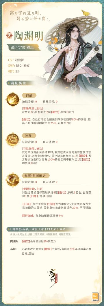 "text": "【新名士前瞻·技能曝光】\n寓形宇内复几时,曷不委心任去留?陶渊明战斗技能曝光!\n身处时局动荡的东晋末年,陶渊明不为五斗米折腰,炼就了委顺自然、超尘脱俗的情志。作为中古时代的大思想家与文学巨匠,他在诗歌、散文、词赋上均取得了辉煌的成就。绚烂之极归于平淡,陶渊明的作品特色便是将丰沛的思想情感寄托于朴素平易的语言之中。\n\n来到忘川后的陶渊明将作为输出名士出战,持醪酣饮,纵浪神释,归园田居爱丘山。使君快戳下图了解一下技能详情吧~ \n\n小麒麟高亮提示:今日#第五届金戈至尊# 决赛夜,半决赛、决赛、策划挑战赛将于今晚19:30-21:30进行,使君大人可以通过游戏内赛事页面的直播入口进行观赛~还可以在「结英定胜」活动中预测当日比赛胜负哦!\n\n☆B站个性装扮套装「忘川风华录·旌旗卷平川」首发开售:https://www.bilibili.com/h5/mall/suit/detail?navhide=1&id=40231&from=official\n☆加入官方社群,交流金戈至尊赛事,赢取专属社群福利:\n☆官方社群: 343548272",