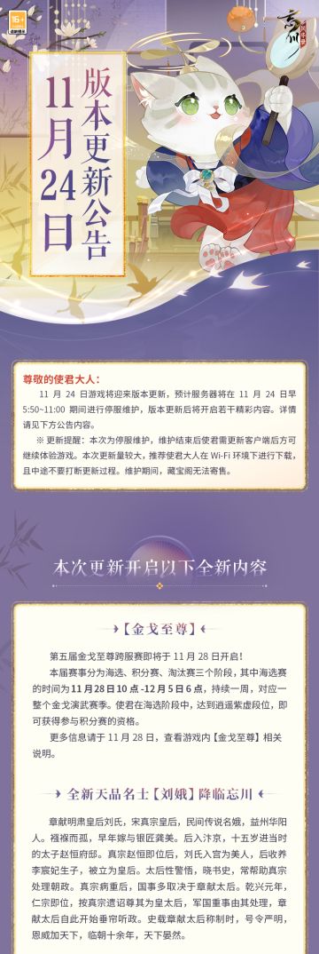 "text": "※11月24日版本更新公告※\n平生诗句领流光,绝爱初冬万瓦霜。初冬随着小雪降临,忘川也将迎来版本更新。小麒麟抱来了最新的内容情报,使君大人快来看看吧~\n\n☆第五届金戈至尊跨服赛11月28日开启! \n☆全新天品名士·刘娥明日入住忘川! \n☆限时活动「子月夜市」同步开启! \n☆高难度副本·喵喵大暴走第十五期即将上线! \n☆更有剧情更新、风仪值、通用换装、九世灵、桃源居、紫薇演星等新功能与优化,静待使君前往体验~\n具体更新内容,请使君大人点击长图查看!\n\n☆B站个性装扮套装「忘川风华录·旌旗卷平川」首发开售:https://www.bilibili.com/h5/mall/suit/detail?navhide=1&id=40231&from=official\n☆加入官方社群,交流金戈至尊赛事,赢取专属社群福利:\n☆官方社群: 343548272",