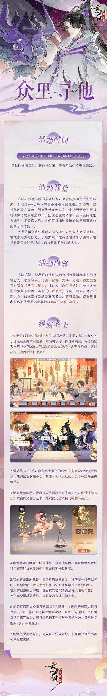 【活动预告· 众里寻他】 众里寻他千百度,蓦然回首,猜猜庐山真面目!百家书院最近又在研究新猜想啦,当筛选能力达到一定程度后,使君们是否能通过零碎的信息准确定位到某个具体的名士呢? 限时活动·「众里寻他」将于【2023年4月13日-2023年4月19日】开启!使君大人快来根据线索抽丝剥茧,揭开名士的神秘面纱吧~ ☆立即下载游戏:https://dream.163.com/ ☆加入官方社群,交流众里寻