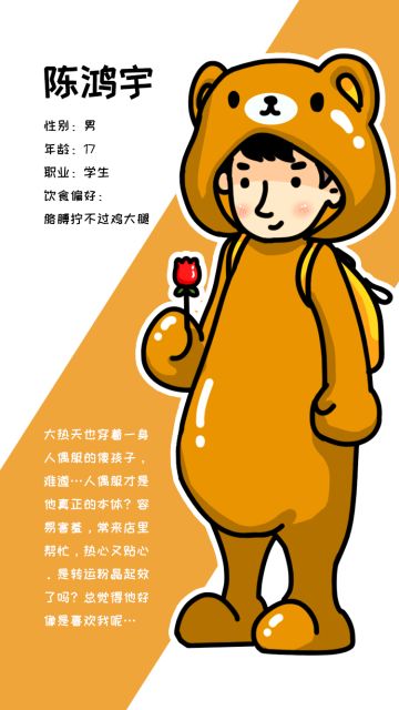 { "text": "小熊弟弟陈鸿宇\n高中生(前几次出现一直穿着熊样子的人偶服装,喜欢牙膏。)\n客人图鉴:\n姓名:陈鸿宇\n性别:男\n年龄:17\n职业:学生\n饮食偏好:胳膊拧不过鸡大腿(解锁食材)。\n大热天也穿着一身人偶服的傻孩子,难道…人偶服才是他真正的本体?容易害羞,常来店里帮忙,热心又贴心。是转运粉晶起效了吗?总觉得他好像是喜欢我呢…\n自言自语:\n1、我没有逃课,你不能凭空污人清白…休息不算逃课…\n2、洗碗、上菜、发传单我都会,让我帮你忙,好不好?\n3、你不说话也不笑的时候,在想什么呢?\n4、一个女孩子每天都这样忙,真的很辛苦啊。\n5、不要只想着喂饱客人,你也要按时吃饭才行呢。\n6、我送的花,你喜欢吗?\n7、我要是去外地读书了,该怎么办呢。\n8、“胳膊拧不过鸡大腿”?哈哈…这种名字…\n9、我给你起个菜名吧,土豆片就叫“to do or not to do”,好不好?\n10、这家店,你会开多久呢?", "raw_text": "" }