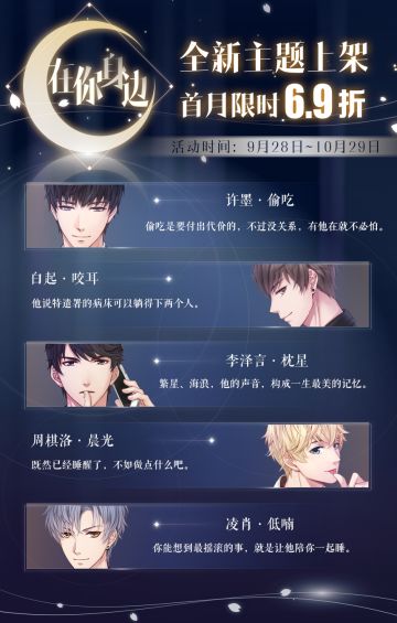 { "text": "#恋与制作人# 在你身边:全新主题上架。\n>>>9月28日,全新主题【在你身边】上架,制作人可前往试听购买。\n周棋洛·晨光\n既然已经睡醒了,不如做点什么吧。\n白起·咬耳\n他说特遣署的病床可以躺得下两个人。\n许墨·偷吃\n偷吃是要付出代价的,不过没关系,有他在就不必怕。\n李泽言·枕星\n繁星、海浪,他的声音,构成一生最美的记忆。\n凌肖·低喃\n你能想到最摇滚的事,就是让他陪你一起睡。\n\n>>>首月限时折扣\n9月28日起,购买指定礼包,立得等额钻石,同时附赠对应陪伴的解锁道具。\n10月29日前购买,还可享受6.9折优惠哦!\n", "raw_text": "" }