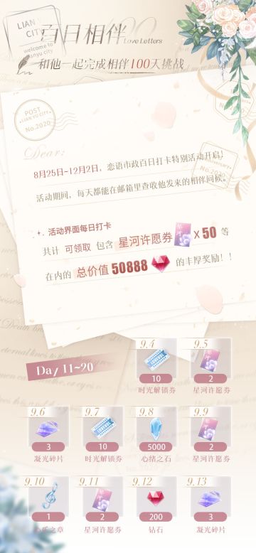 { "text": "#恋与制作人#百日相伴:DAY11~20奖励预告\n转眼九月伊始,和他的百日打卡计划已经进行了十分之一。\n看似漫长的计划,实践起来感觉如何?\n满月清辉照亮夏夜,清晨沁凉的风昭示着夏天即将结束。\nDAY11~20打卡奖励预告\n小哥为大家带来了接下来十天的打卡奖励预览,戳图片即可查看。\n接下来的日子里,一起和夏天的尾巴说再见吧!\n百日相伴活动说明\n8月25日~12月2日,参与恋与市政百日相伴活动,每天都能在邮箱查收他发来的相伴问候。\n每日坚持打卡,更能领取含【星河许愿券*50】在内、价值50888钻的奖励!", "raw_text": "" }