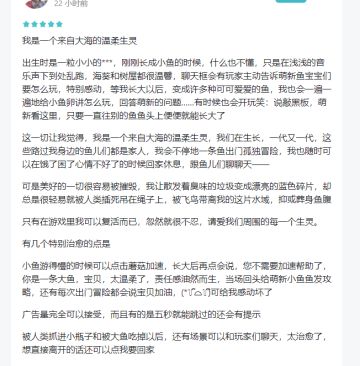 { "text": "感谢宝贝鼓励支持 真好 我们很荣幸您能体会到我们的传达 感谢您如此认真哒评论 宝贵星星 感谢您认真体验游戏 我们后续会做很多更新 记得回海葵屋游荡 看小鱼群们 忙来忙去 感谢您 那些npc大鱼 都是玩家自发呢 他们都很可爱\n", "raw_text": "" }