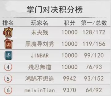 2022年10月侠客所有区服掌门对决积分榜对比