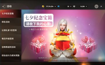 勇士们注意啦! 七夕纪念宝箱活动于2023年8月21日16:00~2023年8月24日04:59开启,每日登录即可领取丰富的惊喜奖励! (游戏活动界面以及奖励如图所示)