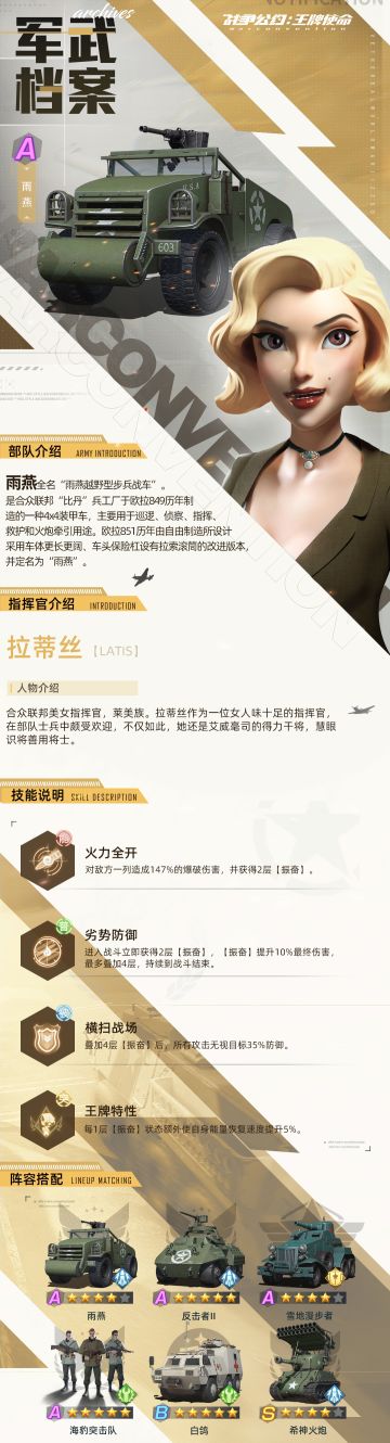 { "text": "#军武档案#\n\n指挥官们好啊~\n本期军武档案——【雨燕】\n由合众联邦美女拉蒂丝指挥,振奋效果可以提升自身能量恢复速度,叠加4层振奋后无视目标35%防御,“火力全开”可对敌方一列造成高额爆破伤害,清扫战场必备~", "raw_text": "" }