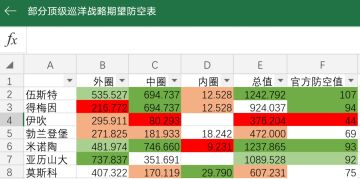 部分顶级巡洋战略期望防空值统计表
