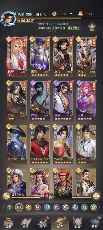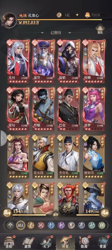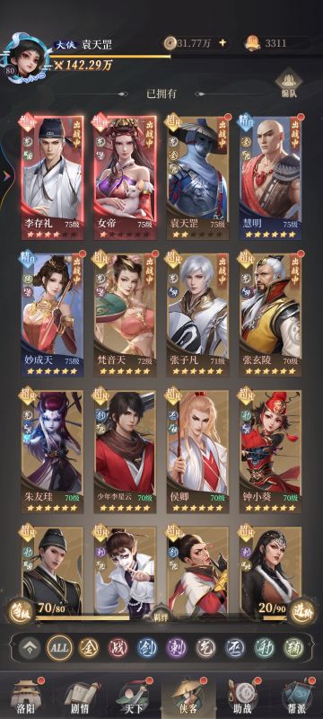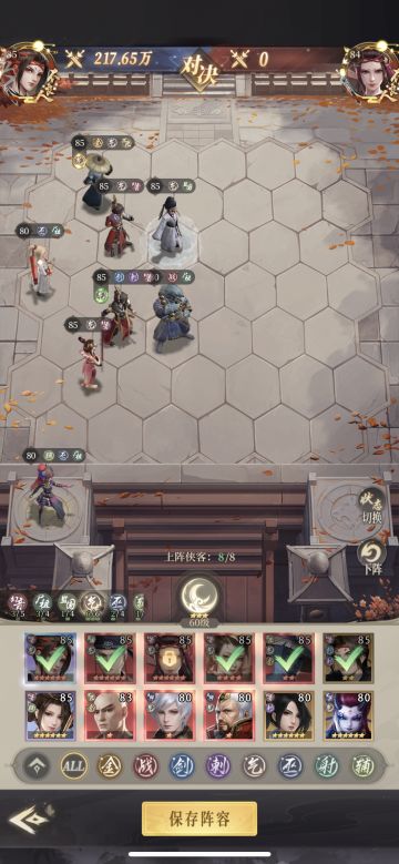 我目前玩的气,所以根据气阵容推荐上面两个打这次法洞的时候用的,气阵容推荐6气3幻音,4气3幻3辅,阵法主镜花水月(里面放你的c),我放的罡子,我罡子红1我个人理解红1罡子好歹还有金的羁绊加护盾了,根据对面各个站位不同,我有以下一系列的站位推荐 当然了根据自己理解站位,我这套是适合我自己的,站位结束了下面到侠客界面推荐,根据你玩的阵容,星高的玩,比如气里面老六高玩老六,女帝高玩女帝,不建议主紫卡和蓝