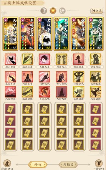 凤夕寨 第二关 比传统阳吸内更容易 拉条更快 还能清debuff。参考战力:该套路下50000+。 简述思路,逍遥拉条,连击清灼烧,流血。解甲,指如疾风拉上限(战力差16w,只能赌脸好)。有至人无己和洗血的带上,至人主运拉条更快更好打。 吸星 天竺 飞龙 七绝 狼牙 不可替代。其余哪个勾高的调和强/极自行调整即可。