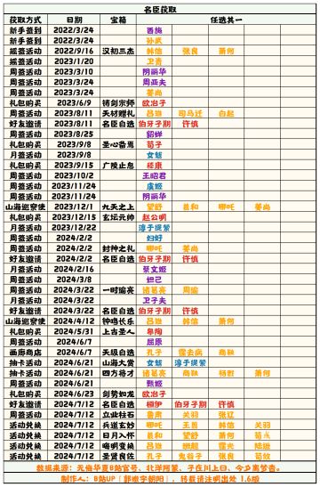 【无悔华夏】名臣获取补充表1.6