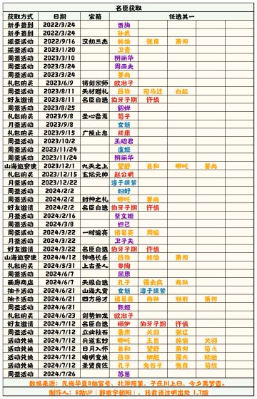 【无悔华夏】名臣获取补充表1.7