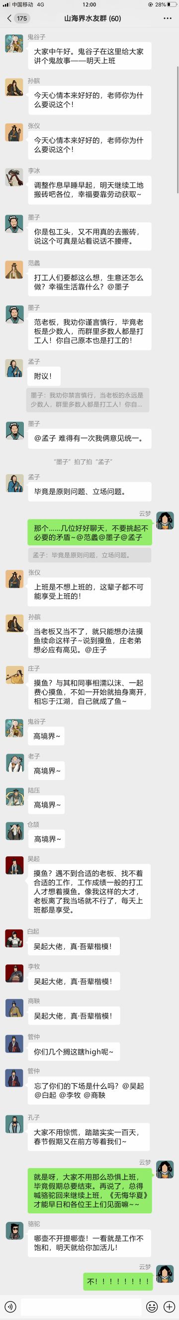 { "text": "刚刚,在山海界群里,鬼谷子讲了个鬼故事——明天就要上班了!!!\n对于这个恐怖的噩耗,群友们的感受又是怎样的呢?让云梦带你去观摩观摩~\n", "raw_text": "" }