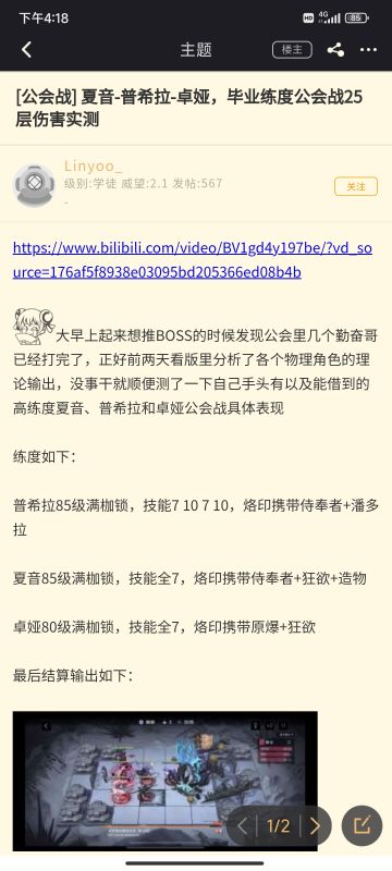 (nga转载)夏音-普希拉-卓娅,毕业练度公会战25层伤害实测