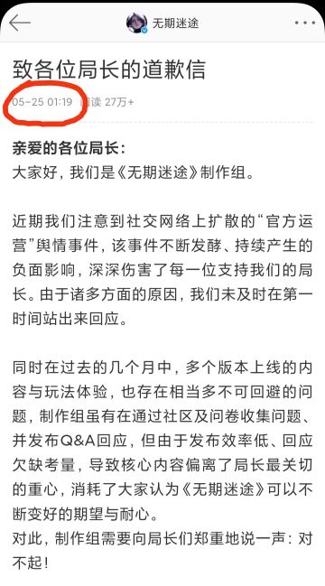 《无期迷途》半夜道歉,回应运营舆情事件