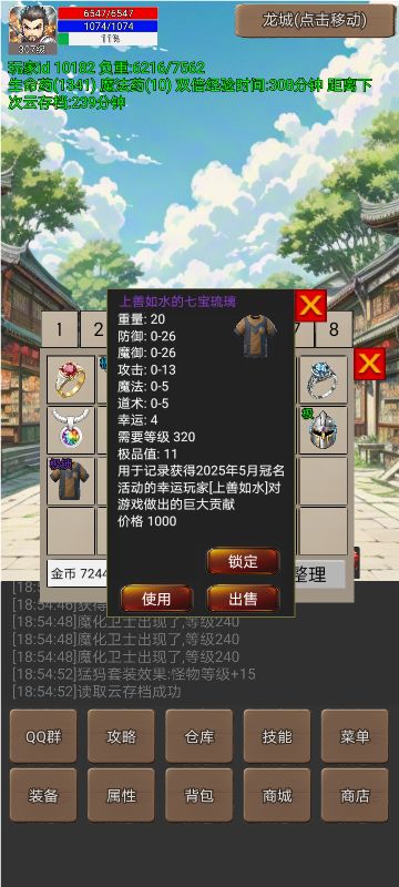 2.新增冠名装备,熊的兽酒葫芦(法宝位置),当前版本为初级法宝,不可升级,后续可使用人物经验提高法宝等级,法宝有隐藏属性:成长性,高成长性的法宝,每次升级增加的属性更高