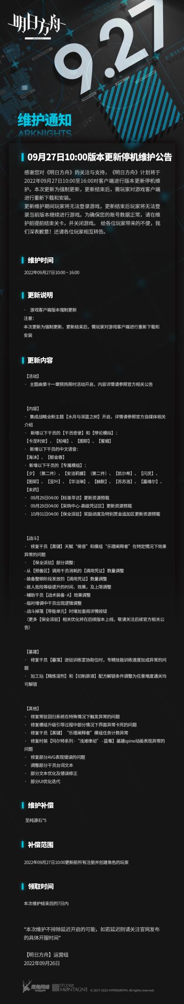{ "text": "09月27日10:00版本更新停机维护公告", "raw_text": "" }