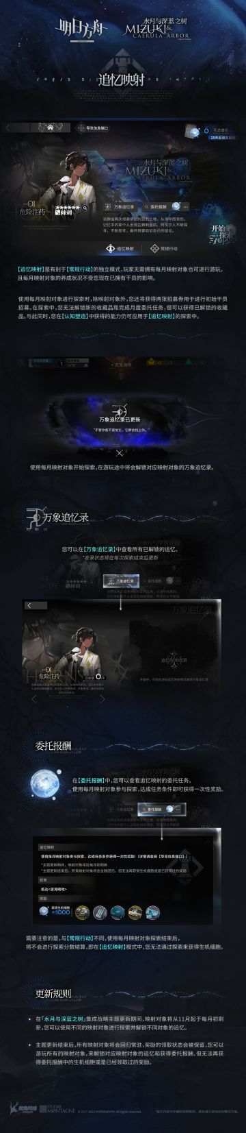 { "text": "集成战略 「水月与深蓝之树」 追忆映射\n\n◆ 【追忆映射】是有别于【常规行动】的独立模式,玩家无需拥有每月映射对象也可进行游玩,且每月映射对象的养成状况不受您现在已拥有干员的影响。\n使用每月映射对象进行探索时,除映射对象外,您还将获得两张招募券用于进行初始干员招募。在探索中,您无法解锁新的收藏品和完成月度委托任务,但可以获得已解锁的收藏品。与此同时,您在【认知塑造】中获得的能力仍可应用于【追忆映射】的探索中。\n◆ 您可以在【万象追忆录】中查看所有已解锁的追忆,收录状态将在每次探索结束后更新。\n◆ 在【委托报酬】中,您可以查看追忆映射的委托任务,使用每月映射对象参与探索,达成任务条件即可获得一次性奖励。需要注意的是,与【常规行动】不同,使用每月映射对象探索结束后,将不会进行探索分数结算,即在【追忆映射】模式中,您无法通过探索来获得生机细胞。\n◆ 在「水月与深蓝之树」集成战略主题更新期间,映射对象将从11月起于每月初刷新,您可以使用不同的映射对象进行探索并解锁不同对象的追忆。\n主题更新结束后,所有映射对象将会回归常驻,奖励的领取状态会被保留,您可以游玩所有的映射对象,来解锁对应映射对象的追忆和获得委托报酬。但无法再获得委托报酬中的生机细胞或是已经领取过的奖励。\n\n_________________\n更多「水月与深蓝之树」集成战略主题内容,请持续关注《明日方舟》官方自媒体账号。", "raw_text": "" }