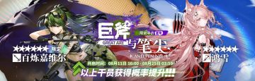 { "text": "[限定寻访·夏季]【巨斧与笔尖】限时寻访即将开启\n\n活动时间:08月11日 16:00 - 08月25日 03:59\n活动说明:活动期间【限定寻访·夏季】-【巨斧与笔尖】寻访开启,该寻访中以下干员出现率上升\n★★★★★★:百炼嘉维尔[限定] \\ 鸿雪(占6★出率的70%)\n★★★★★★:假日威龙陈 [限定] (在6★剩余出率【30%】中以5倍权值出率提升)\n★★★★★:晓歌(占5★出率的50%)\n\n寻访数据契约交换所开启时间:08月11日 16:00 - 08月28日 03:59\n\n注意:\n◆【巨斧与笔尖】为【限定寻访·夏季】系列寻访\n◆【限定寻访·夏季】寻访为【限定寻访】\n◆新增干员【鸿雪】、【晓歌】除加入【巨斧与笔尖】外,将在08月18日04:00后加入并常驻【标准寻访】卡池\n◆新增干员【百炼嘉维尔】为【限定寻访·夏季】限定干员,不会加入任何【标准寻访】\n◆限定干员【百炼嘉维尔】在本次寻访结束后,将不会在2023年07月01日前加入任何【限定寻访】\n\n 【限定寻访·夏季】说明\n◆【限定寻访·夏季】寻访为【限定寻访】\n◆【限定寻访·夏季】的限定干员在今后的【限定寻访·夏季】中会再次登场\n◆【限定寻访·夏季】的限定干员在今后的【限定寻访·夏季】以外的【限定寻访】中存在再次登场的特殊情况\n◆【限定寻访·夏季】的限定干员在今后的【限定寻访】中会存在出率提高的特殊情况\n\n【限定寻访】说明\n◆在所有【限定寻访】中,如果连续50次没有获得6星干员,则下一次获得6星干员的概率将从原本的2%提升至4%,如果该次还没有寻访到6星干员,则下一次寻访获得6星的概率由4%提升到6%。依此类推,每次提高2%获得6星干员的概率,直至达到100%时必定获得6星干员\n\n◆在任意两个不同的【限定寻访】中,没有获得6星干员的累计次数不会累计,该次数会因为【限定寻访】的结束而清零。因为累计次数而增加的获得概率,不会应用于接下来任意一次【限定寻访】\n\n◆在所有【限定寻访】中,每进行一次寻访,可获取一张【寻访数据契约】,寻访十次则可获取十张【寻访数据契约】,【寻访数据契约】可用于当期【寻访数据契约交换所】兑换指定干员\n 注意:\n◆任何时候在【限定寻访】中获得一位6星干员,则下一次在【限定寻访】中获得6星干员的概率将恢复到2%\n◆在当期【限定寻访】中所获得的【寻访数据契约】存在使用期限。在当期【寻访数据契约交换所】关闭后,剩余未兑换的【寻访数据契约】将会被自动兑换成【寻访参数模型】,每张【寻访数据契约】自动兑换成六张【寻访参数模型】。【寻访参数模型】不存在使用期限,可用于【寻访参数模型交换所】兑换指定物品。\n◆5倍权值指在6星干员概率分布中【假日威龙陈[限定]】的获得概率提高,而除【百炼嘉维尔[限定] \\ 鸿雪】外的其他单个6星干员的获得概率相应降低,使得【假日威龙陈[限定]】达到其他单个6星干员(除【百炼嘉维尔[限定] \\ 鸿雪】外)获得概率的5倍。\n\n更多活动内容请持续关注《明日方舟》游戏内公告、官网、官方微博及微信公众号。", "raw_text": "" }